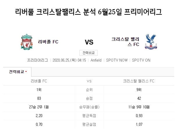 리버풀 크리스탈팰리스 분석 6월25일 프리미어리그