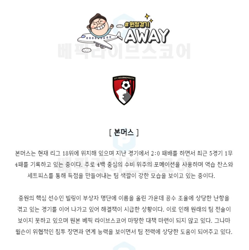 본머스는 현재 리그 18위에 위치해 있으며 지난 경기에서 2:0 패배를 하면서 최근 5경기 1무 4패를 기록하고 있는 중이다.