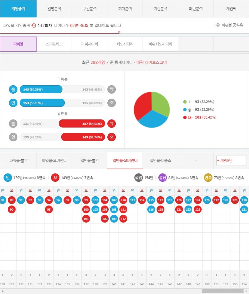 파워볼 숫자선택게임: 1~28까지 일반볼 5개, 0~9까지 파워볼 1개, 총 6개의 숫자를 선택하는 게임이며, 게임은 5분마다 진행됩니다. 파워볼 숫자합게임: 일반볼 홀/짝 게임, 대/중/소 게임, 숫자합구간 게임, 파워볼 구간 선택 게임. 첫번째는 공이 6개가 나오는데 이중에 마지막 공을 파워볼이라고 하며, 이 공이 언더(0~4) 또는 오버(5~9)를 맞추거나 숫자가 홀 또는 짝인지를 맞추는 게임입니다. 그렇기 때문에 적즁률이 50%이라고 볼 수 있습니다. 언더 또는 오버, 홀 또는 짝 2개중에 하나의 값을 맞추는 게임이기 때문에 확률적으로 보면 50%정도라고 할 수 있어요. 다른 미니게임과 마찬가지로, 운과 감으로 맡길 수 없는 게임입니다. 게임을 제대로 즐기기 위해서는 분석이 필수입니다!